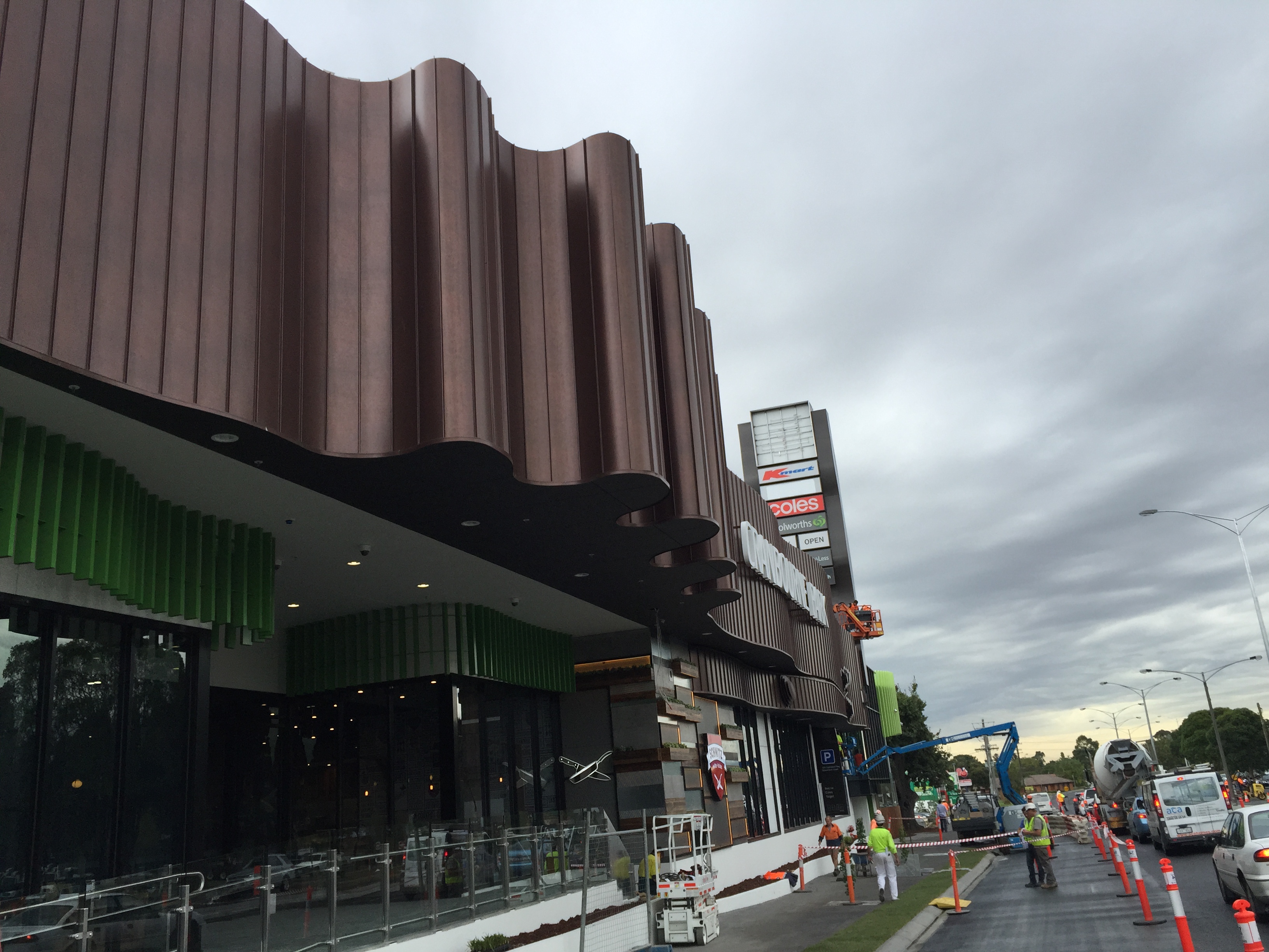 The stunning wave-form Corten like cladding and slat façade is already sparking much interest as it nears completion. The architectural philosophy of the ribbon facade and the heritage oak tree on site can be read about here. Internally the public have been teased with a glimpse of what to expect with the existing mall also being rejuvenated with similar feature ceilings, mall tiling and shopfront treatment that will be exemplified in the new extension.