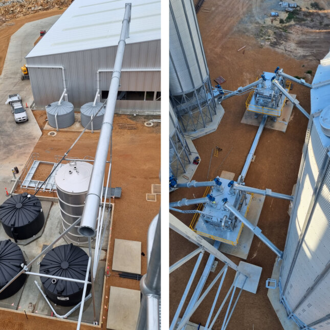 Above left: View from above the four integrally bunded liquid storage tanks. The vacuum line from the straw milling shed can be seen in the foreground. The straw milling shed has been part of the staged delivery of equipment and resources to the site with it functioning as both the receivals depot and light fabrication space. Above right: The batch weighing sorters connected to the bases of the 2600 ton storage silo matrix. These will soon be enclosed by sheds.