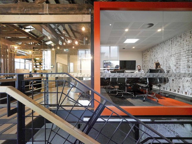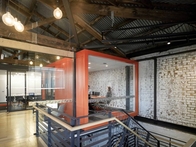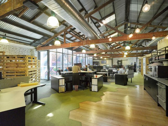 The converted warehouse features a mix of raw materials and vibrant colours, with a strong essence of i2C’s playful and unconventional nature thrown in. The industrial aesthetic begins with a bold orange shipping container jutting into the open entry stairwell and follows through with bright, recycled accent furniture pieces where you least expect them. Pallets are scattered throughout the Studio in the form of wall claddings and partitions with expressed structural elements and exposed fittings complementing the existing raw timber roof trusses overhead. Underneath these you’ll find the team working away amongst the winding collaborative workstations, grouped and gathered together in their day-to-day functions.