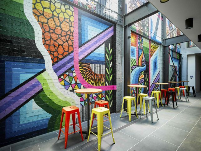 It’s not all work and no play though! The vibrant façade of the building finds its way inside to the courtyard at the heart of the building, where Beastman’s vision really comes to life. The colourful, geometric mural is offset by lush planting features created by Plant Image. Our new Sustainability Lead is definitely a fan, spearheading a biophilic campaign with encouragement for more planting right throughout the interior. Watch this space!