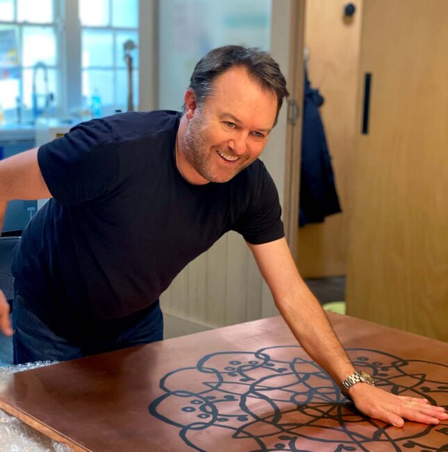 Constructed from raw copper, the i2C team will each place their hands in natural, acidic solutions before placing them directly on the artwork. The resulting chemical reaction leads to a multi-layered, collaborative and ever evolving artwork. The many layers come together to produce a lasting effect, to symbolise the unity within the team. The artwork will spend part of the year in each studio location ensuring each team member will have an opportunity to sit with and experience the artwork.