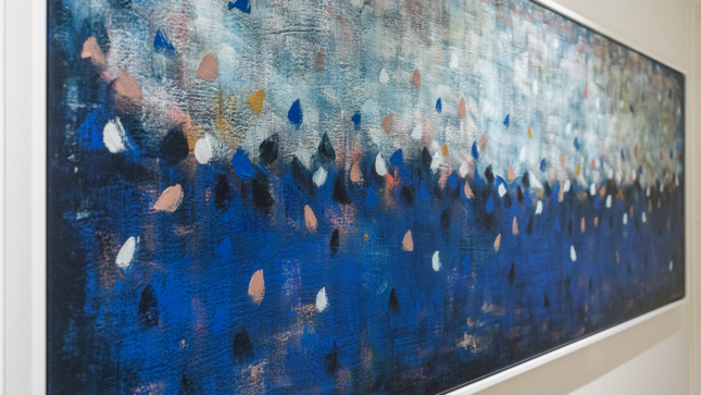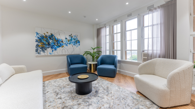 The waiting room alongside was anchored with a washed-out Persian rug, giving texture to the space. The subtle pattern of the rug sat peacefully again the neutral tones of the furniture in creams, denim blue and black. The space, again, highlighted the stunning artwork on the walls.