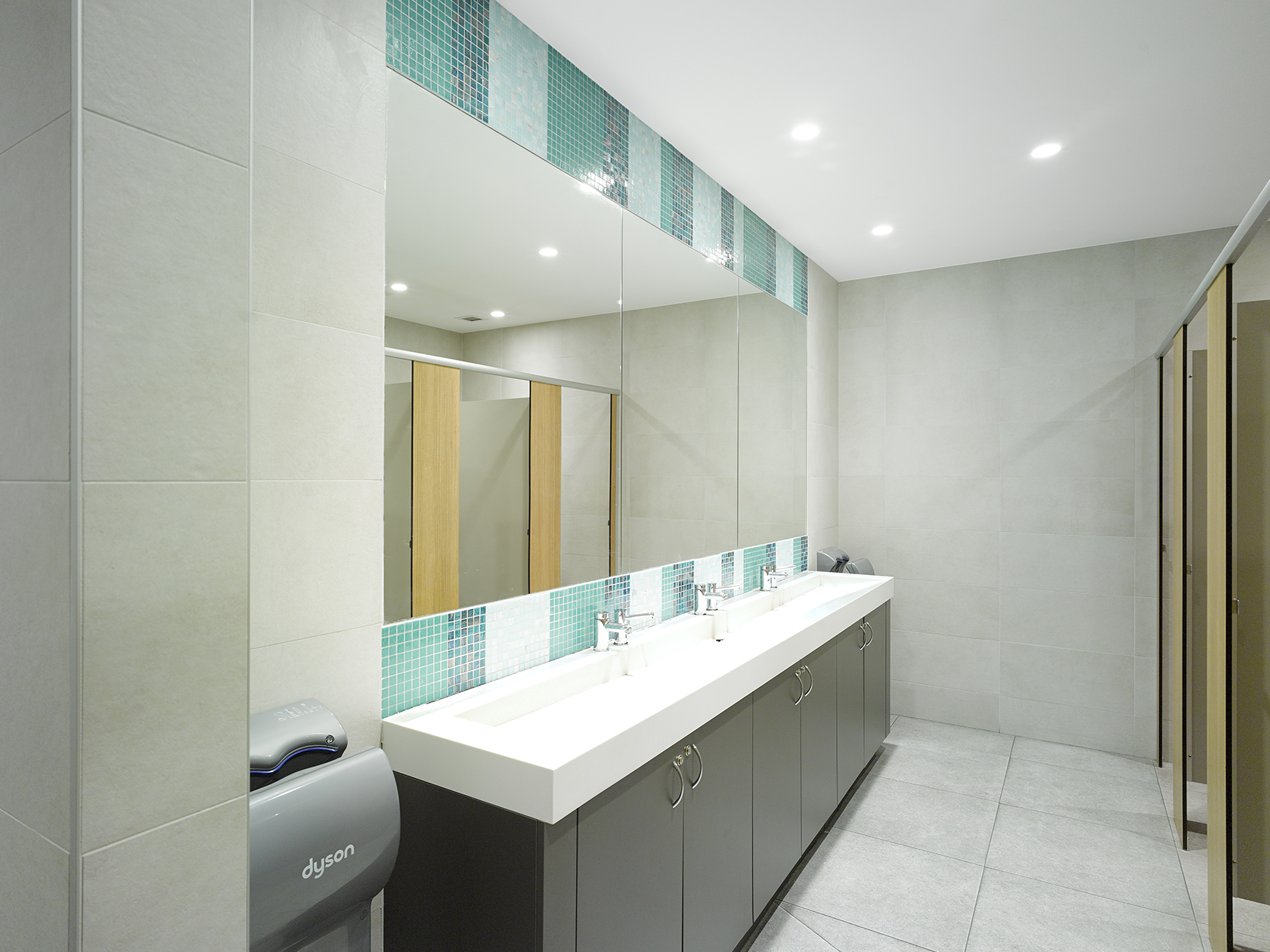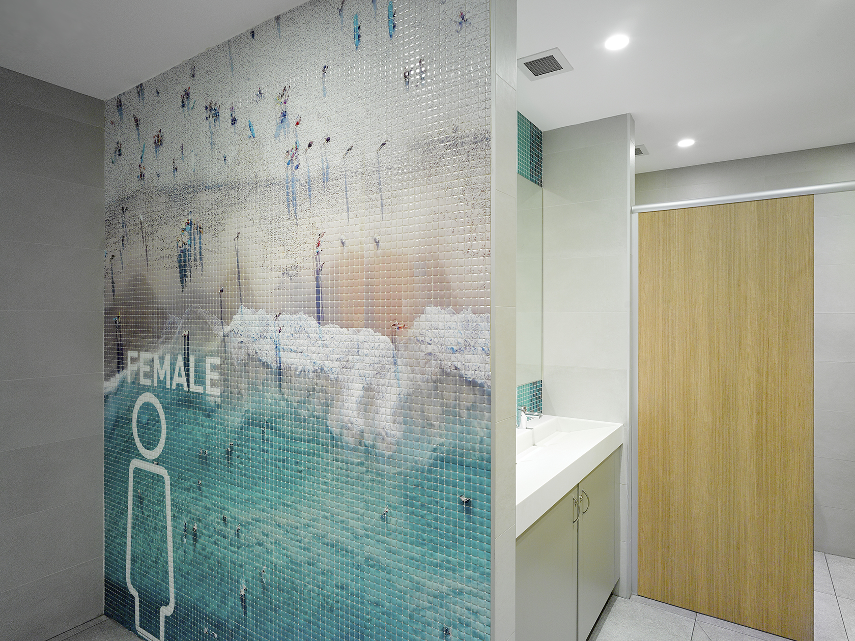 Focusing on i2C’s “Why” of inspiring ideas to enhance the human experience, our first challenge lay in the planning of the amenities. Both clumsy and difficult to manoeuvre, we completely restructured the layouts to form easy to use spaces for not only the customer but cleaner’s alike. Next, we moved onto the entries, knowing that the needed to set the tone and celebrate our design intent. We approached an artist to use his aerial imagery of local highlights as the main feature walls and signage to the new amenities. These feature entry walls not only enhance the sense of arrival to the amenities but also creates a sense of place. With the beach and short line as our inspiration, our palette features ocean colouring paired with natural teak and woody greys. This takes form inside the amenities where the customer can discover teal and aquamarine mosaic tiling to mirrored walls, solid sublime teak partition walls and natural greys with sleek white moulded benchtops.