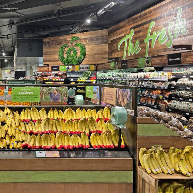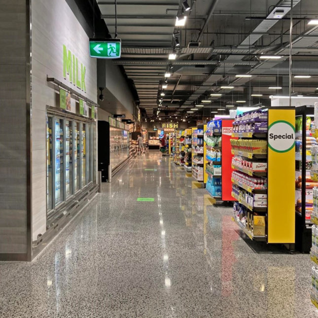 This West End branch of Woolworths was earmarked as a high-end offering and is currently the newest and most advanced Woolworths in Queensland. It has premium finishes throughout such as timber cladding to columns as well as display tables and bulkheads in the produce section, a polished concrete floor throughout the trading floor and modern sign gantries and white subway tiles to all trading floor departments and entry columns along the shopfront. Some new features include a flatbread machine in the bakery and a Scan&Go checkout. A modern lighting scheme and colour palette also look to enhance the shopping experience.