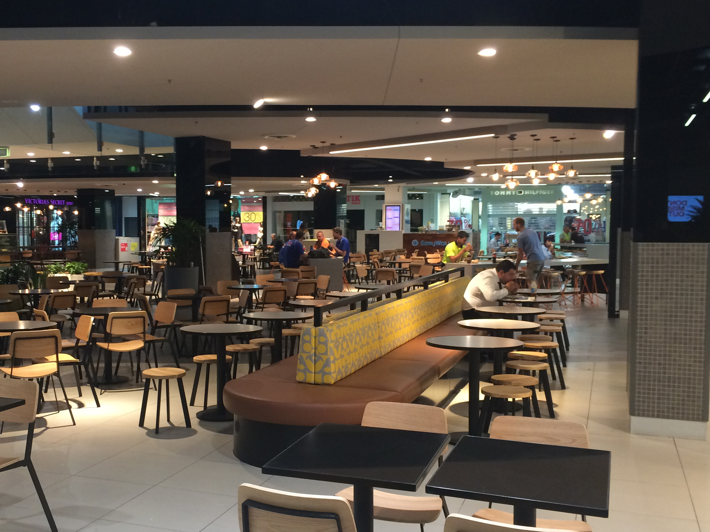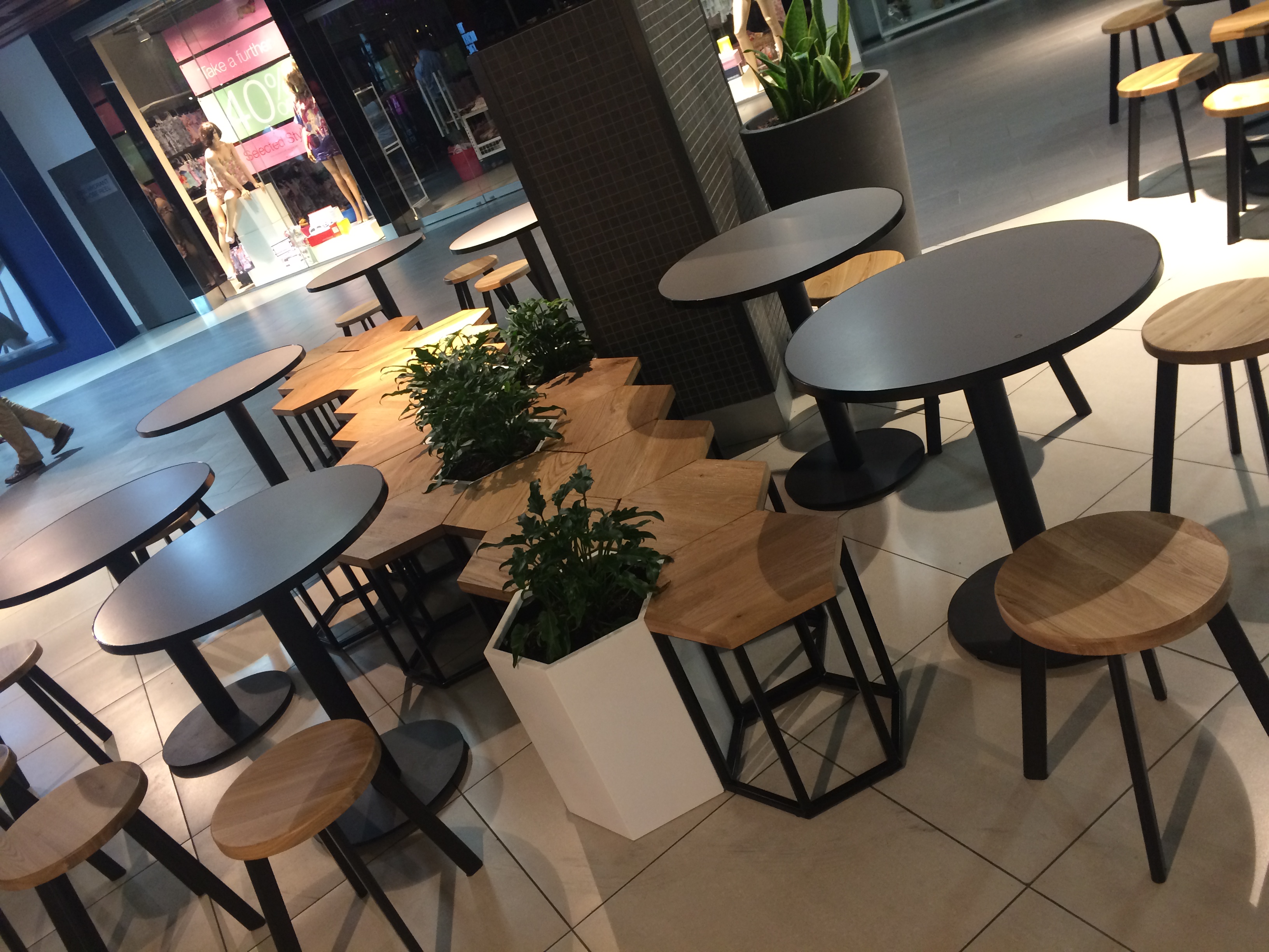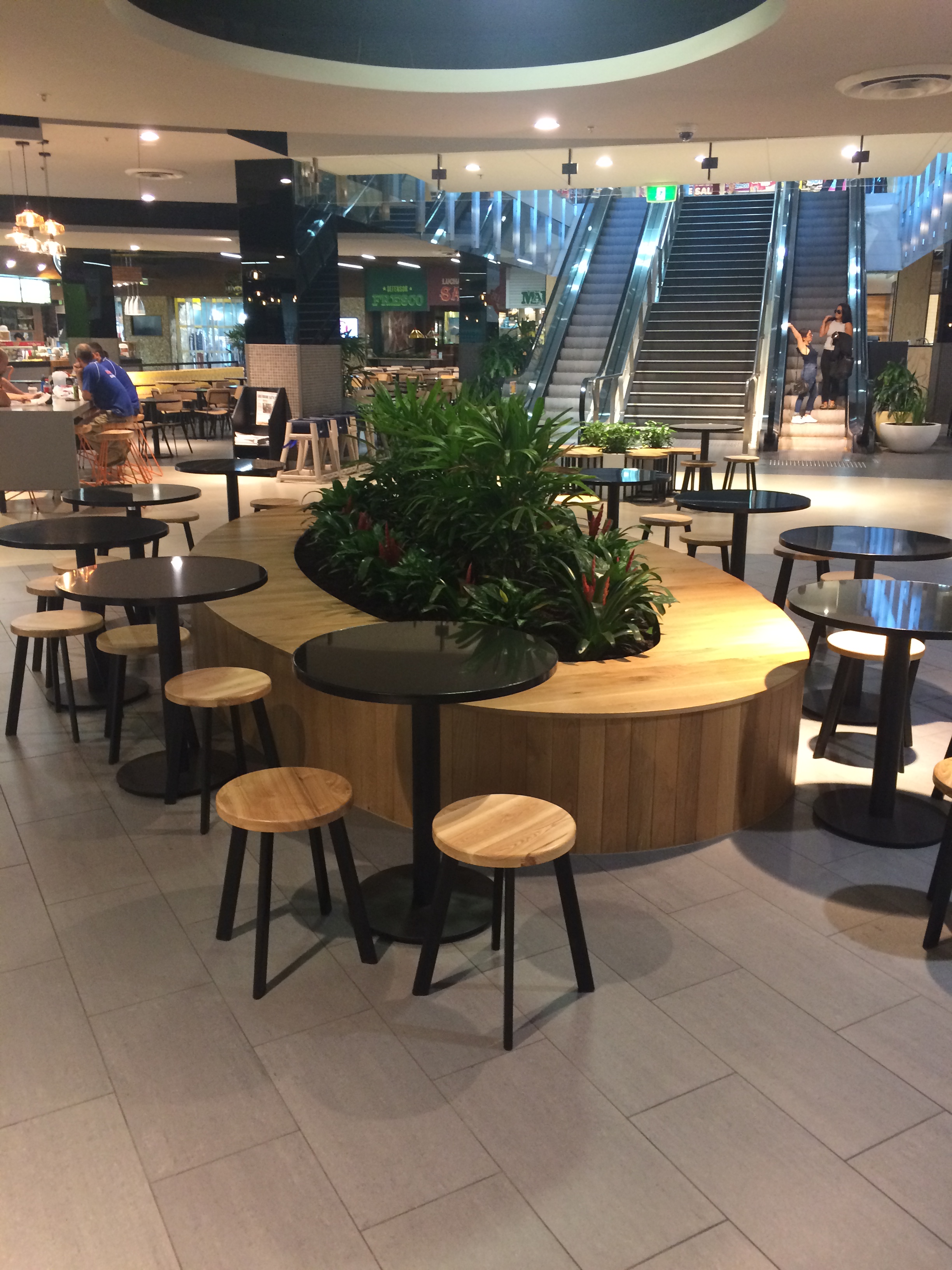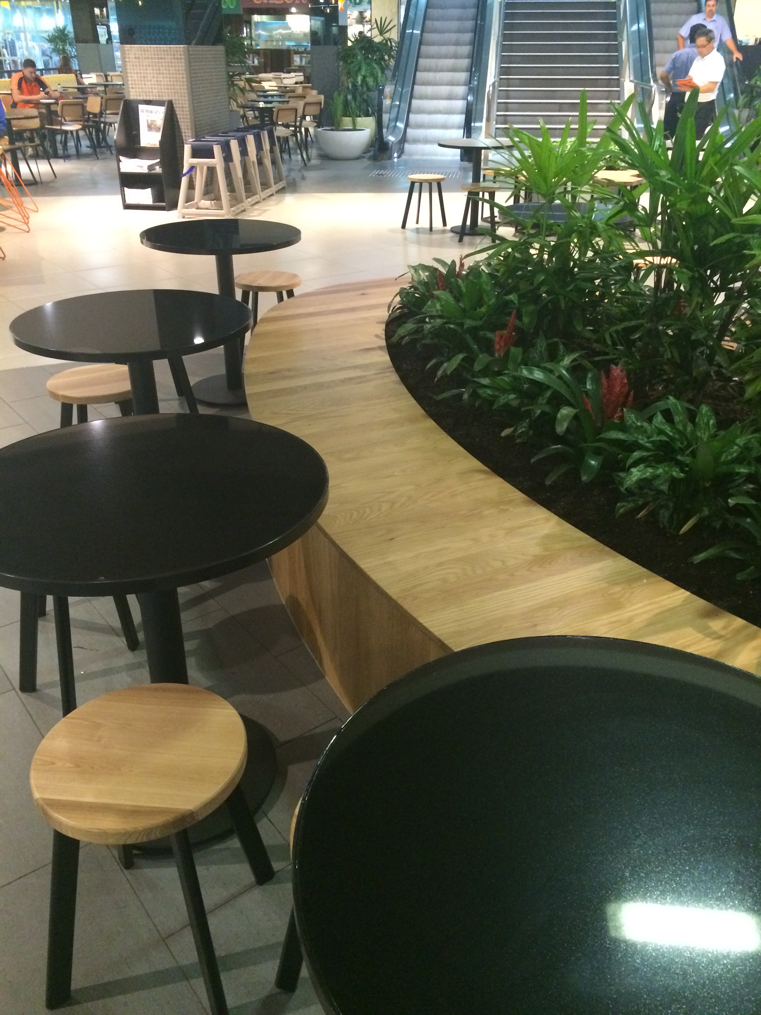 The use of creepers, timber battens and green wall has brought the mall area to life (with more to come in the next few weeks). The columns and the elevator wall clad in black mirrors really adds a touch of class. Modern furniture and pendants adorn the food court and look amazing.