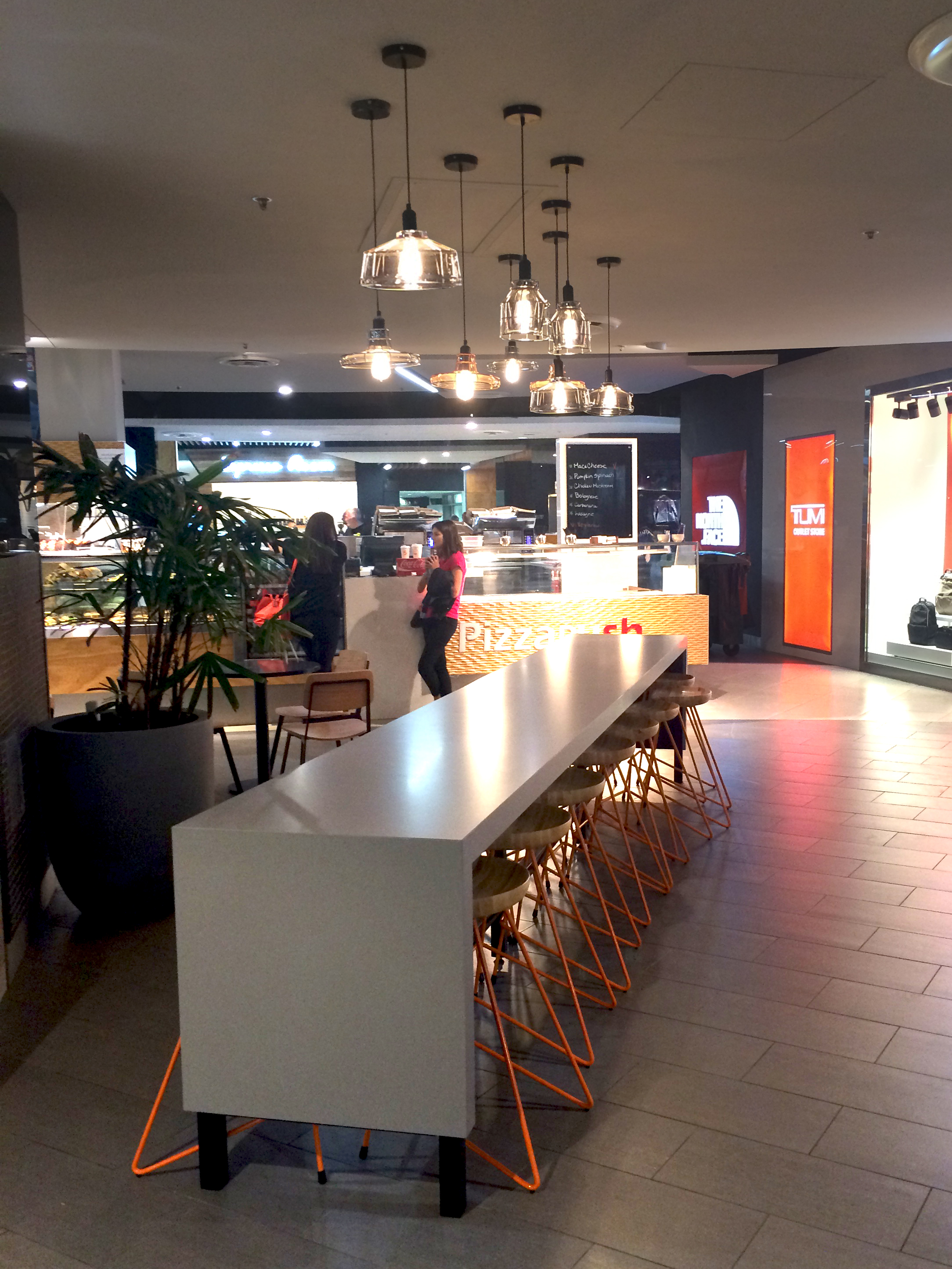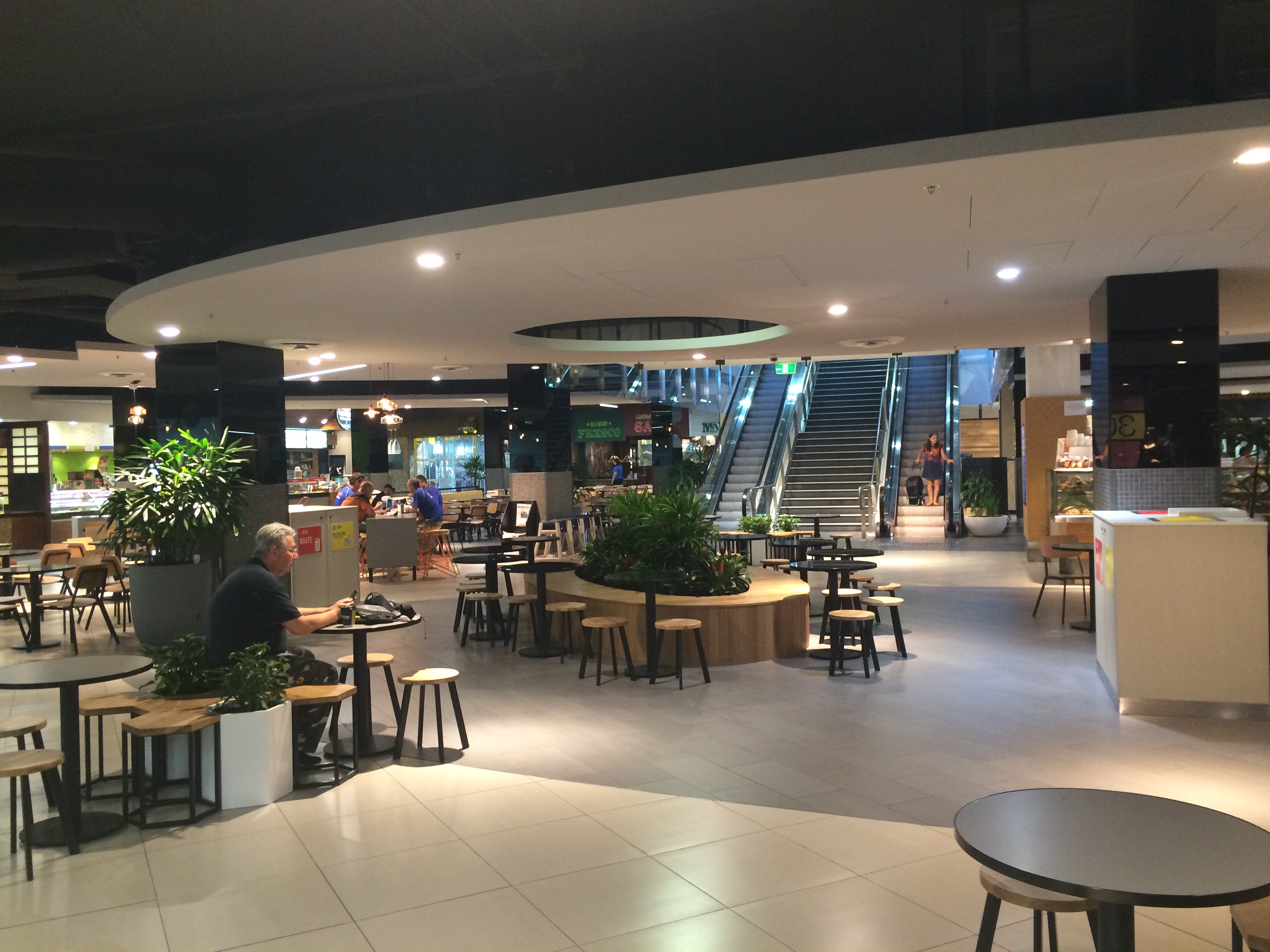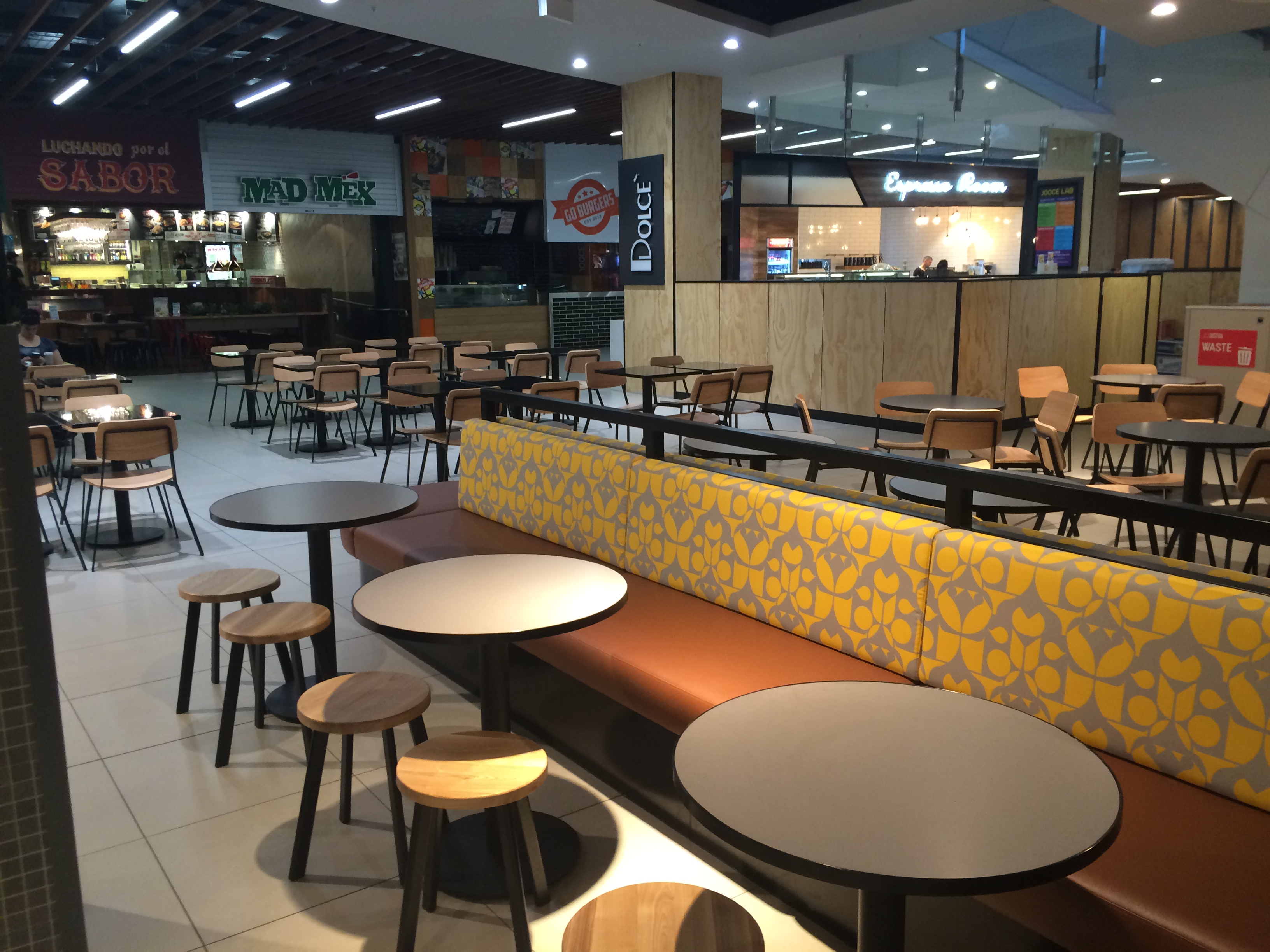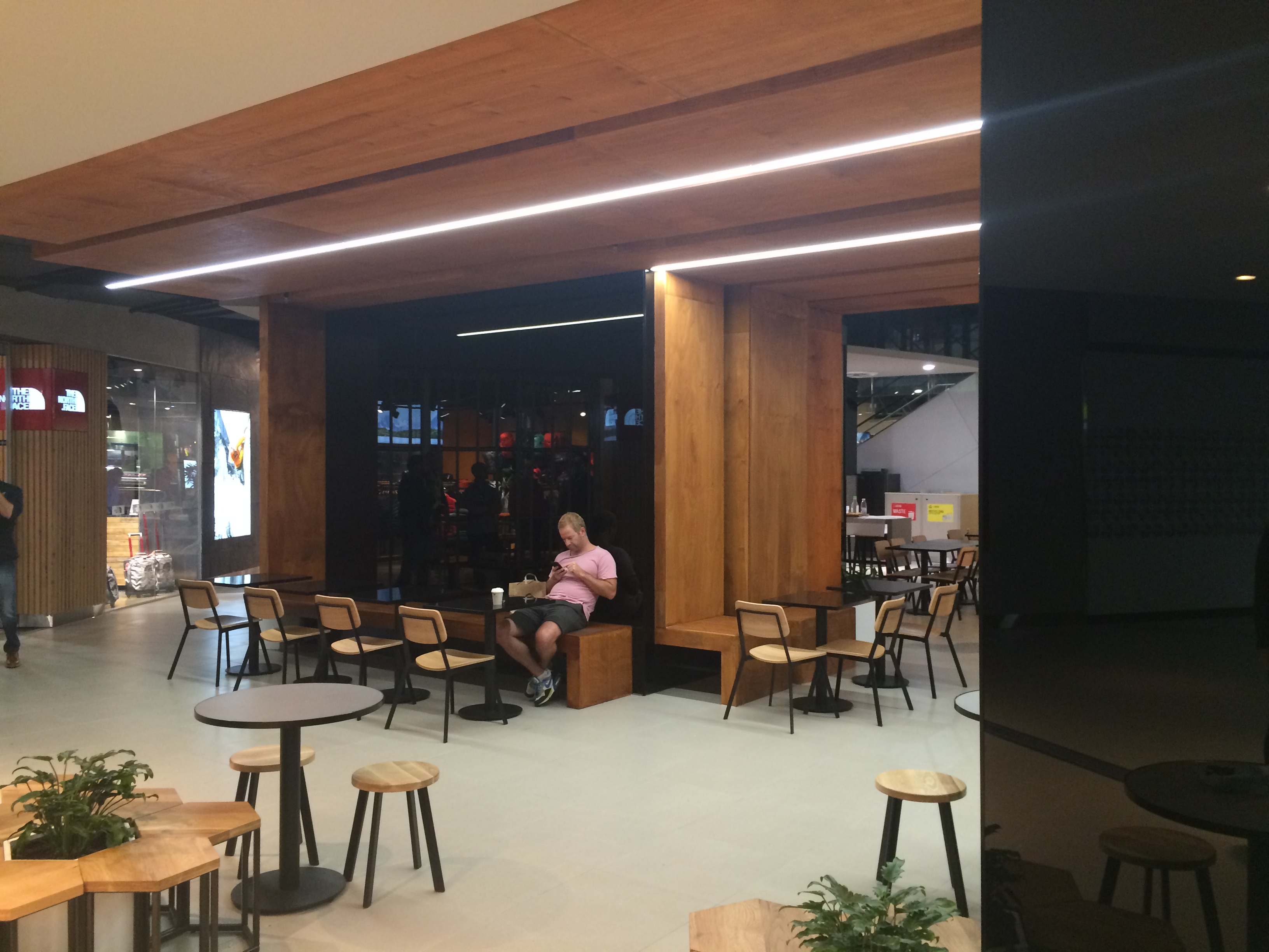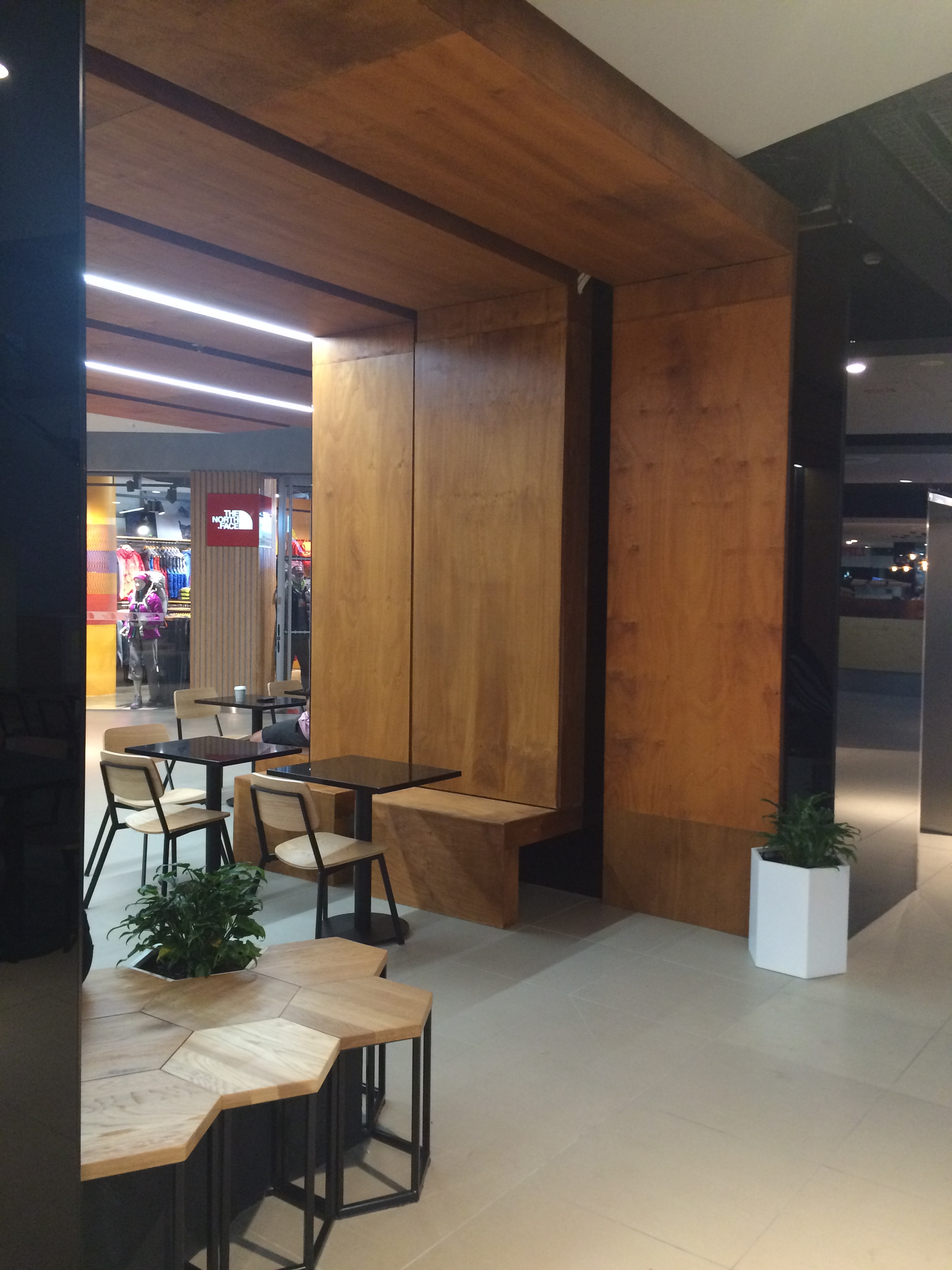 The use of creepers, timber battens and green wall has brought the mall area to life (with more to come in the next few weeks). The columns and the elevator wall clad in black mirrors really adds a touch of class. Modern furniture and pendants adorn the food court and look amazing.