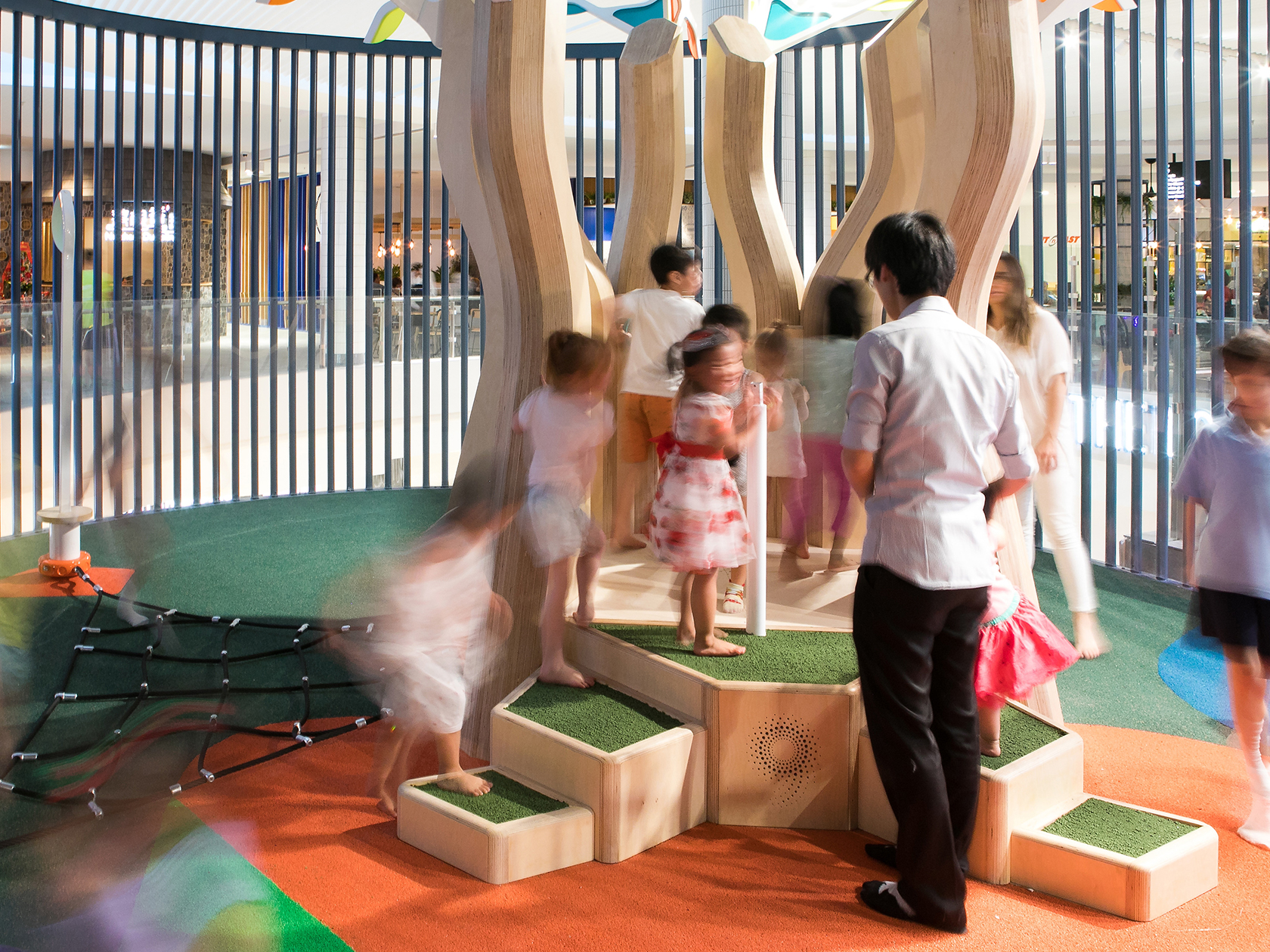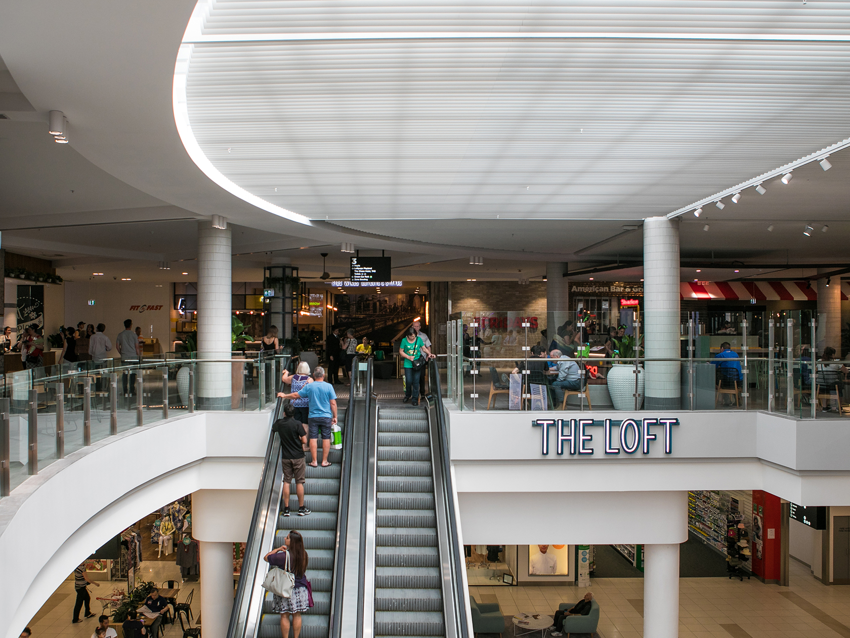 The new central louvred ceiling feature on Level Three allows natural light from the existing barrel vault skylight through to the mall below. The new curved floor matches the line of the ceiling above while the adjacent section of floor overhanging void houses part of a new interactive kids play area.