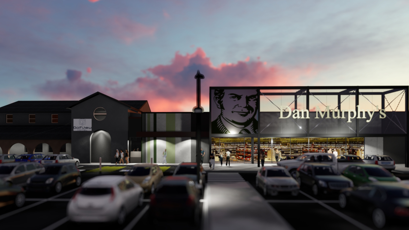 In 2012 ALH Group engaged us to investigate opportunities to build a new Dan Murphy’s on the site known for the Golfview Hotel in Guildford. As the name suggests the existing pub is located adjacent to the Golf Club set within an industrial area facing a busy road and local residents.