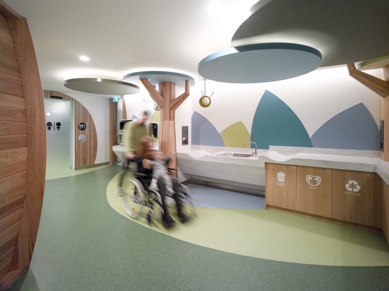 The Parent’s Room was a key focus throughout the design process. This space was critical in the planning of the amenities as it’s such an important part of the centre for parents. It’s more than somewhere to change a nappy – it’s a place for children to re-energise and parent’s to take a break; a place that meets all its functional requirements and most importantly a place that feels inviting and comfortable, like an extension of your home. It was also important to the Client and i2C that the Parent’s Room was accessible. Extra care was taken working with Access consultants to ensure all criteria were met to allow any individual to use the space – everything from reach-ability, to lighting levels, to circulation space.